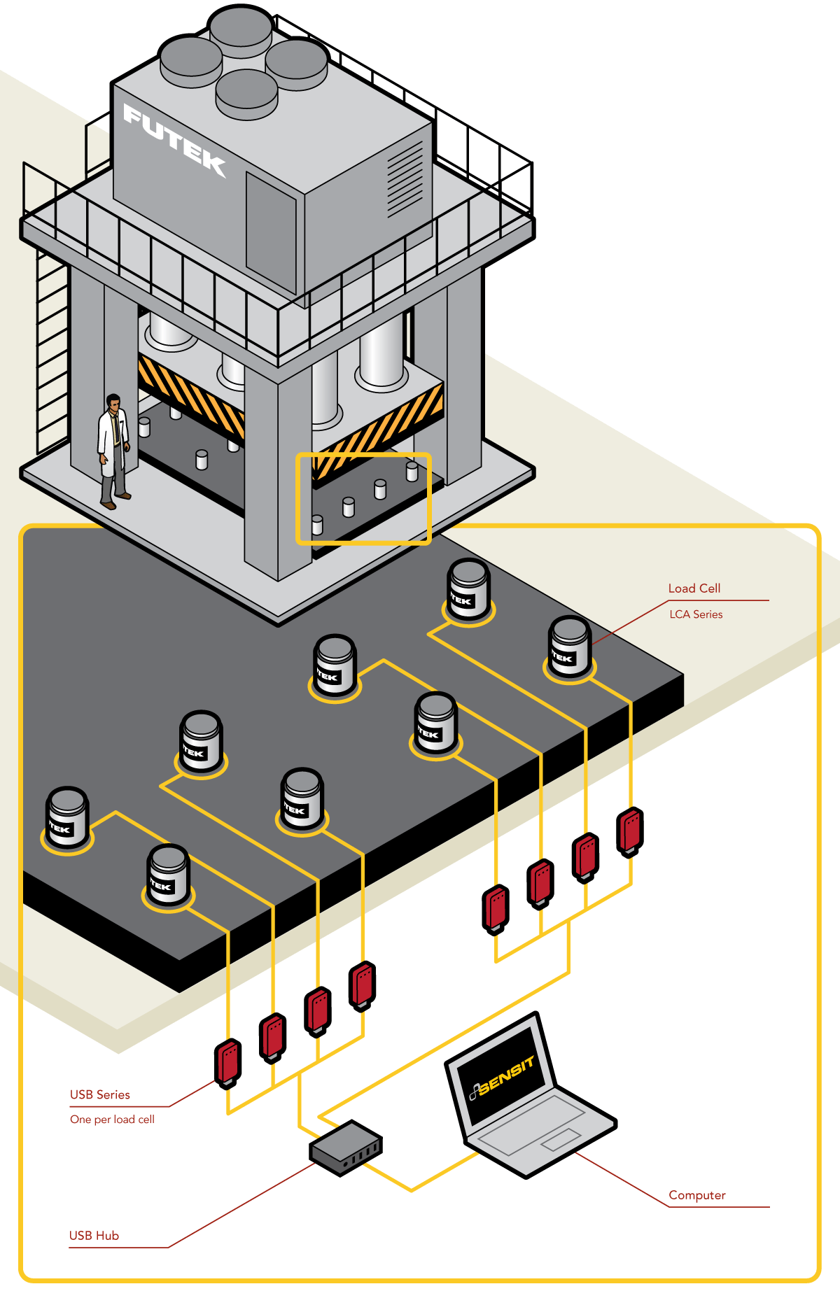 3、当压力机向LCA传感器施压时,传感器的数据通过AG平台的USB采集模块传输到电脑上,SENSIT软件实时显示传感器受到的压制力,监测压力机的输出力是否合格。