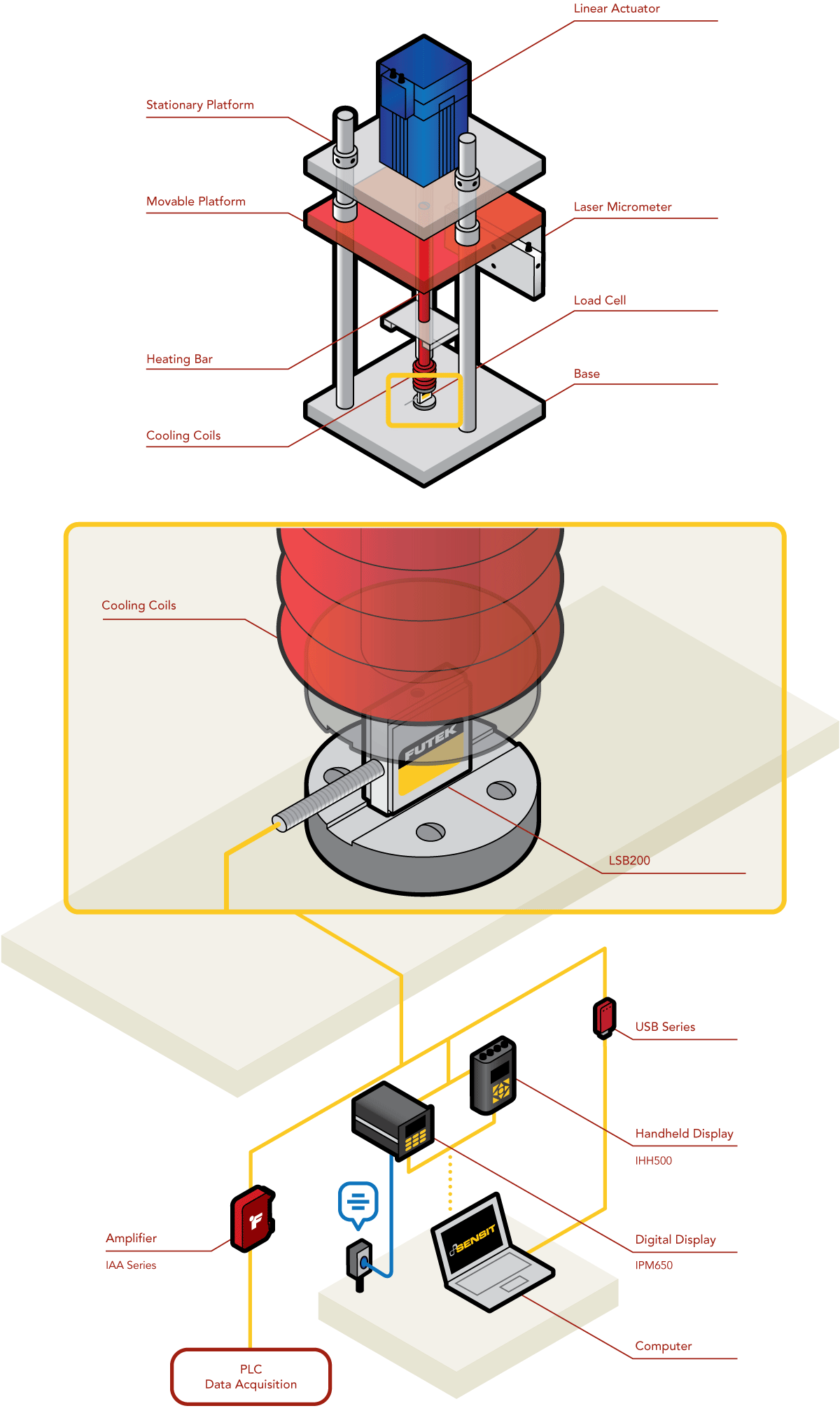 2、AG平台 LSB200微型S型传感器安装在测力台架的底部,正对着加热棒和冷却盘管下方。LSB200传感器特殊的设计,使得传感器在台架加热和冷却降温的过程中,测试结果不受影响。