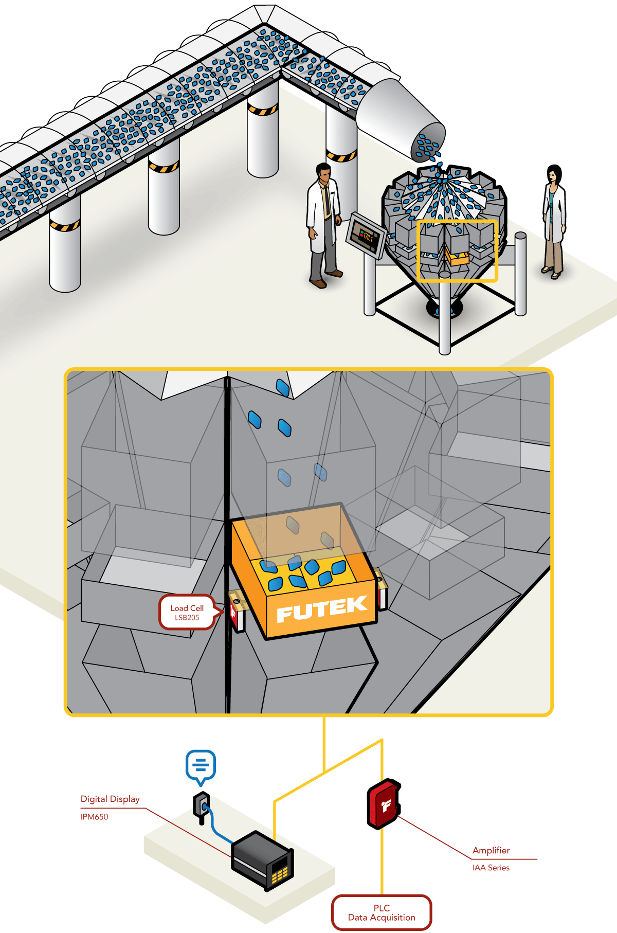 3、在该应用中,每个分配器上安装两只AG平台 LSB200微型力传感器,LSB200(带10倍于量程的过载保护)称量分配器中产品的数量。