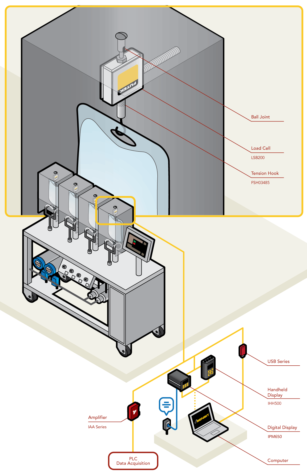 4、LSB200传感器(带有特殊的过载保护结构),将测量得到的拉力信号通过相关仪器仪表传输出去,这些仪器仪表包括:CSG110放大器、IHH500手持式仪表、IPM650显示仪表和者USB采集模块。