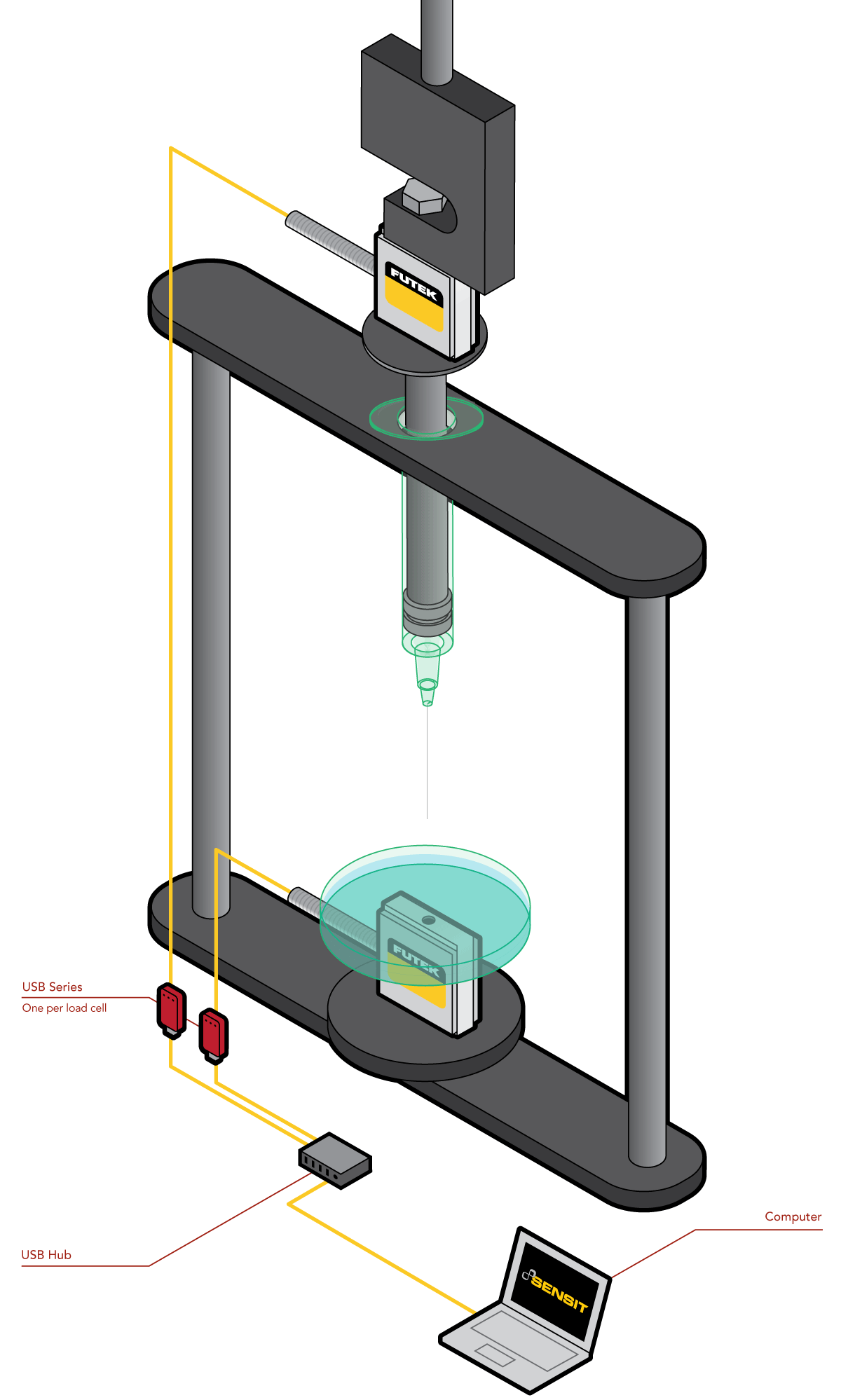 1、在机械测试台架的操作杆上,安装一只LSB200微型测力传感器,测量注射器注射药物时的注射杆上的推力。