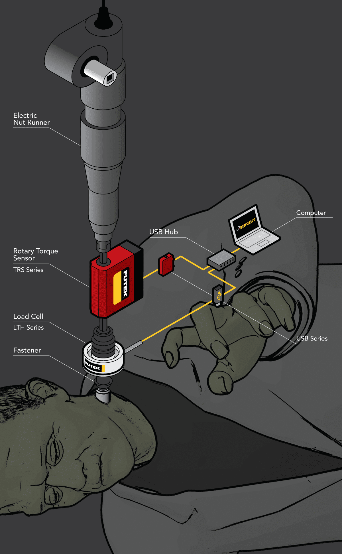 驱动:电动螺丝刀/电机,扭力传感器:AG平台的TRH605,测力传感器:AG平台的中空型LTH系列,信号处理:AG平台的USB520和IDA100,终端显示:AG平台的SENSIT软件、PLC