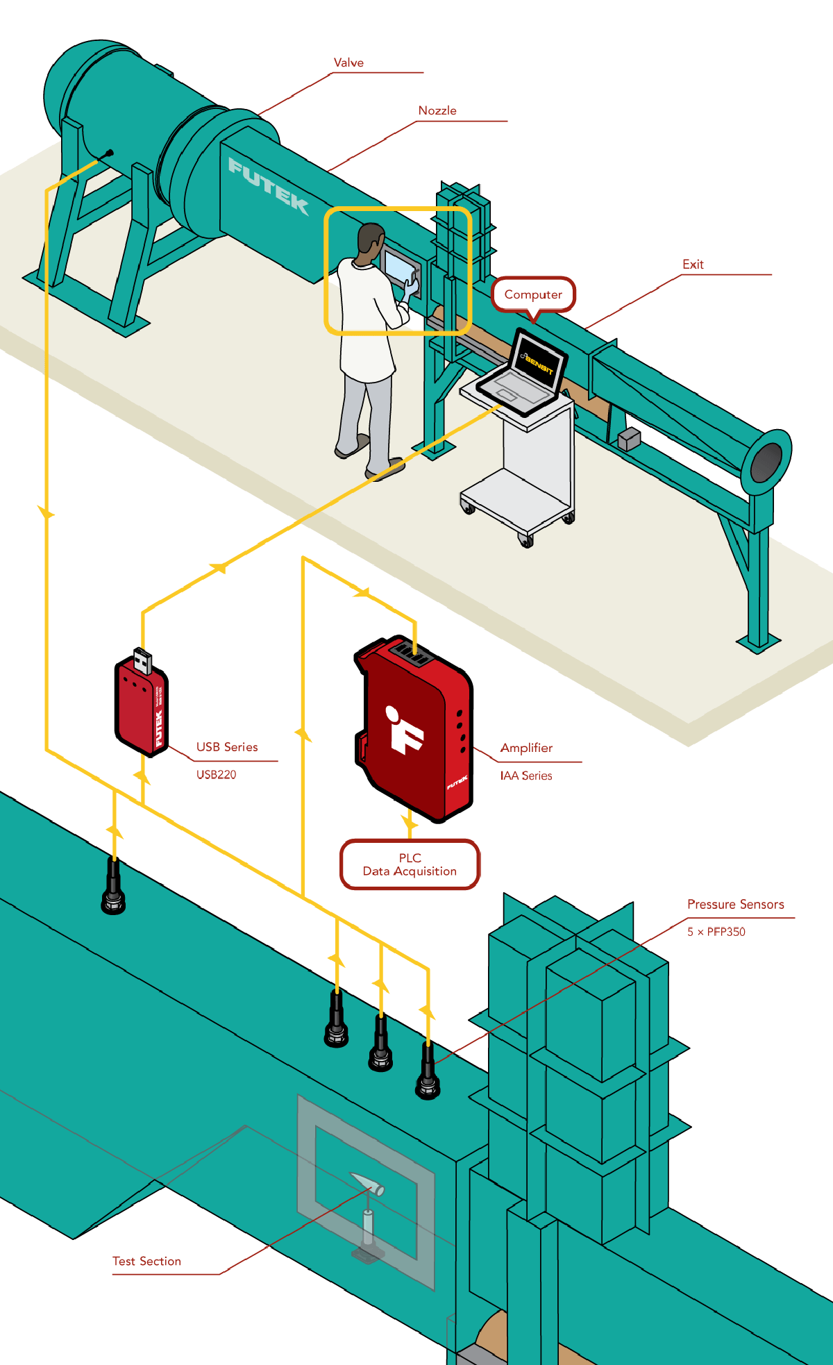 1、PFT510AG平台安装在风洞中的临界点。在本例中,传感器安装在压力箱、喉管和测试区域的三个位置上。